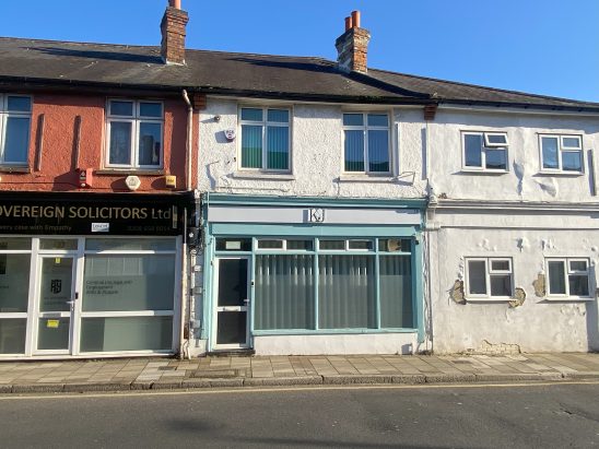 The subject property comprises a mid-terrace two-storey building with glazed shop frontage, set out beneath a pitched roof.